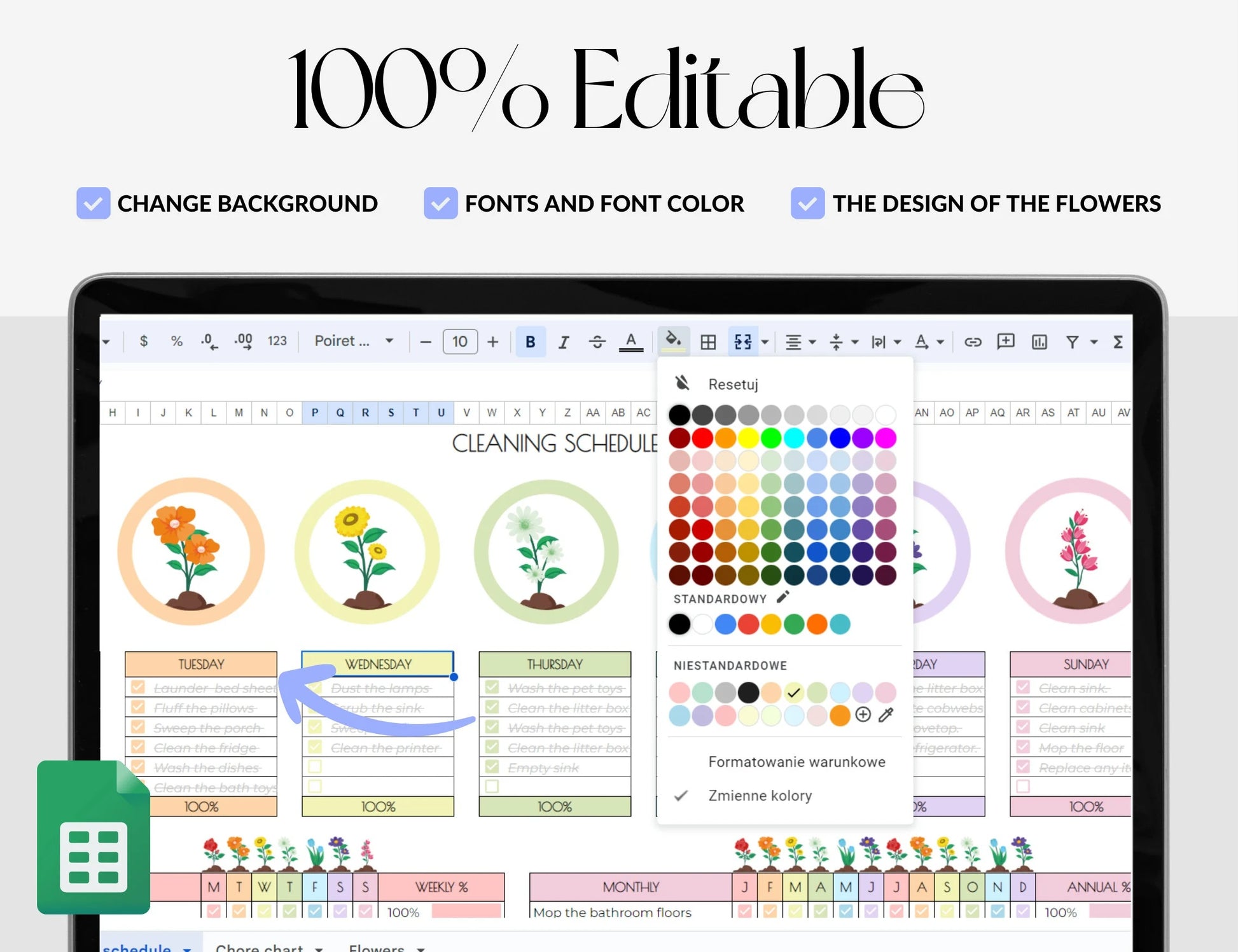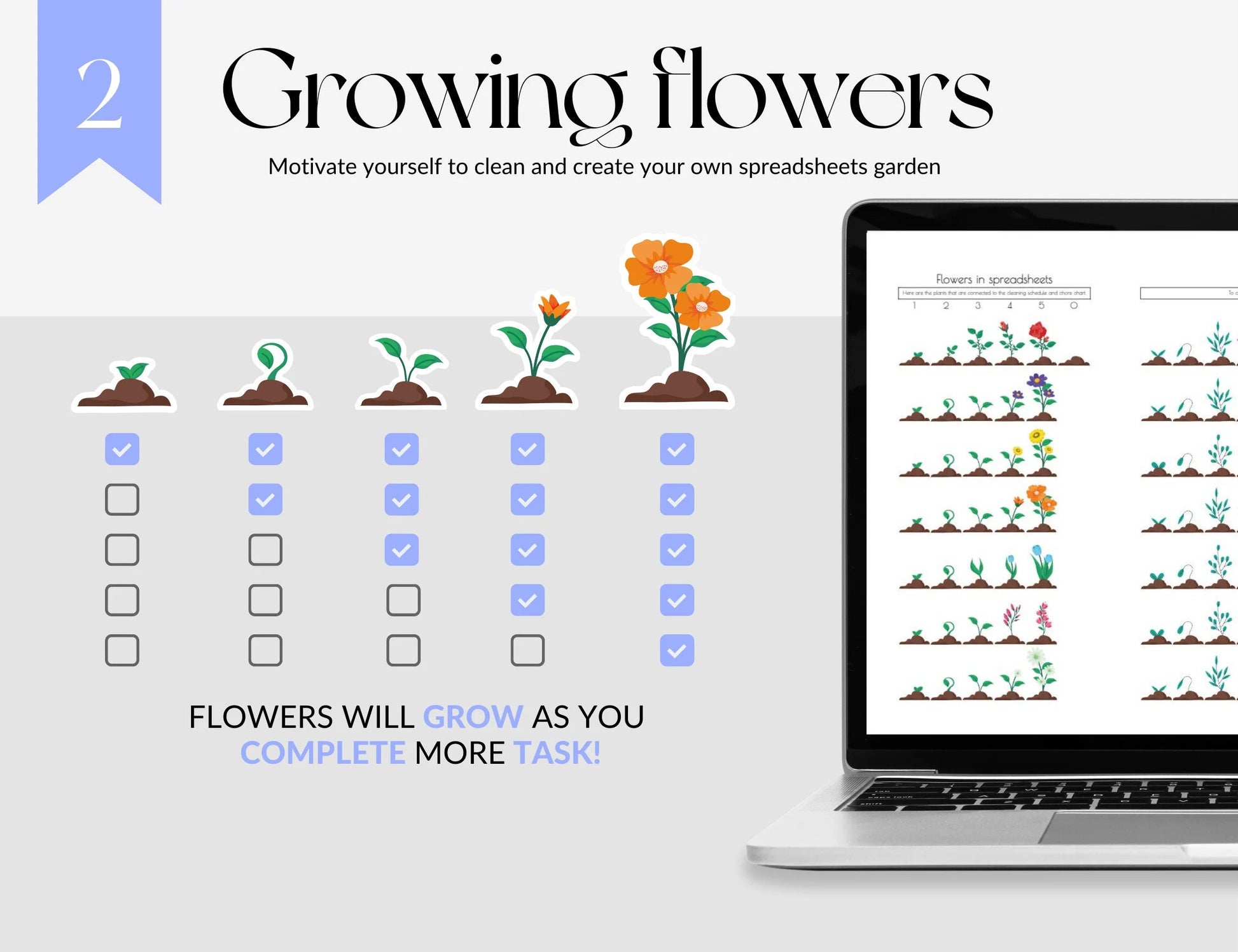 Growing Flowers progress: two versions to choose fromProgress bar and charts to track the progressPercentage summaries that calculate everything automatically.