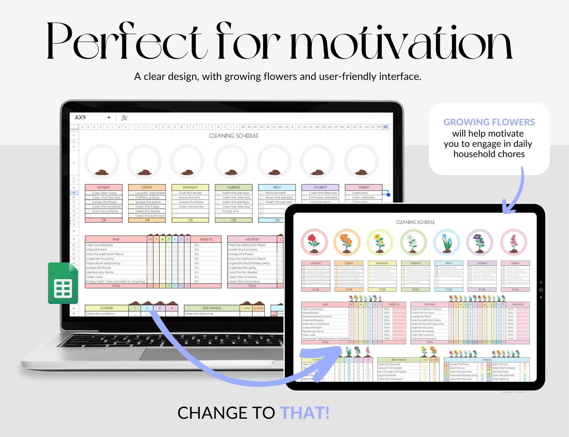It's an all-in-one Cleaning List and To-Do List template, perfect for every home! What's Included: Table divided into: day, week, month, quarter, half-year, year.
